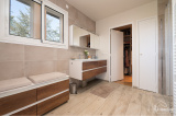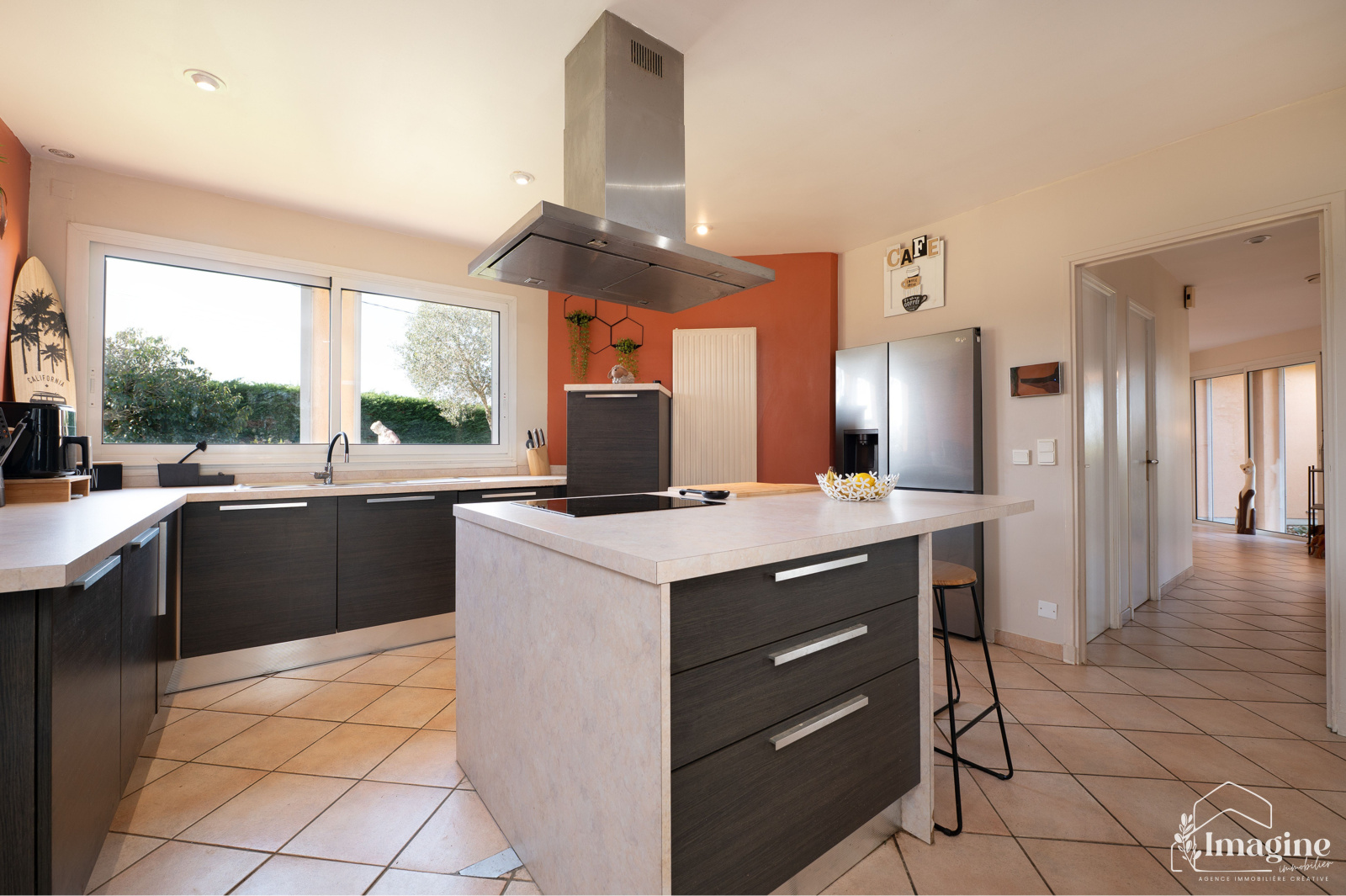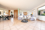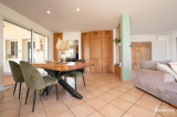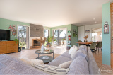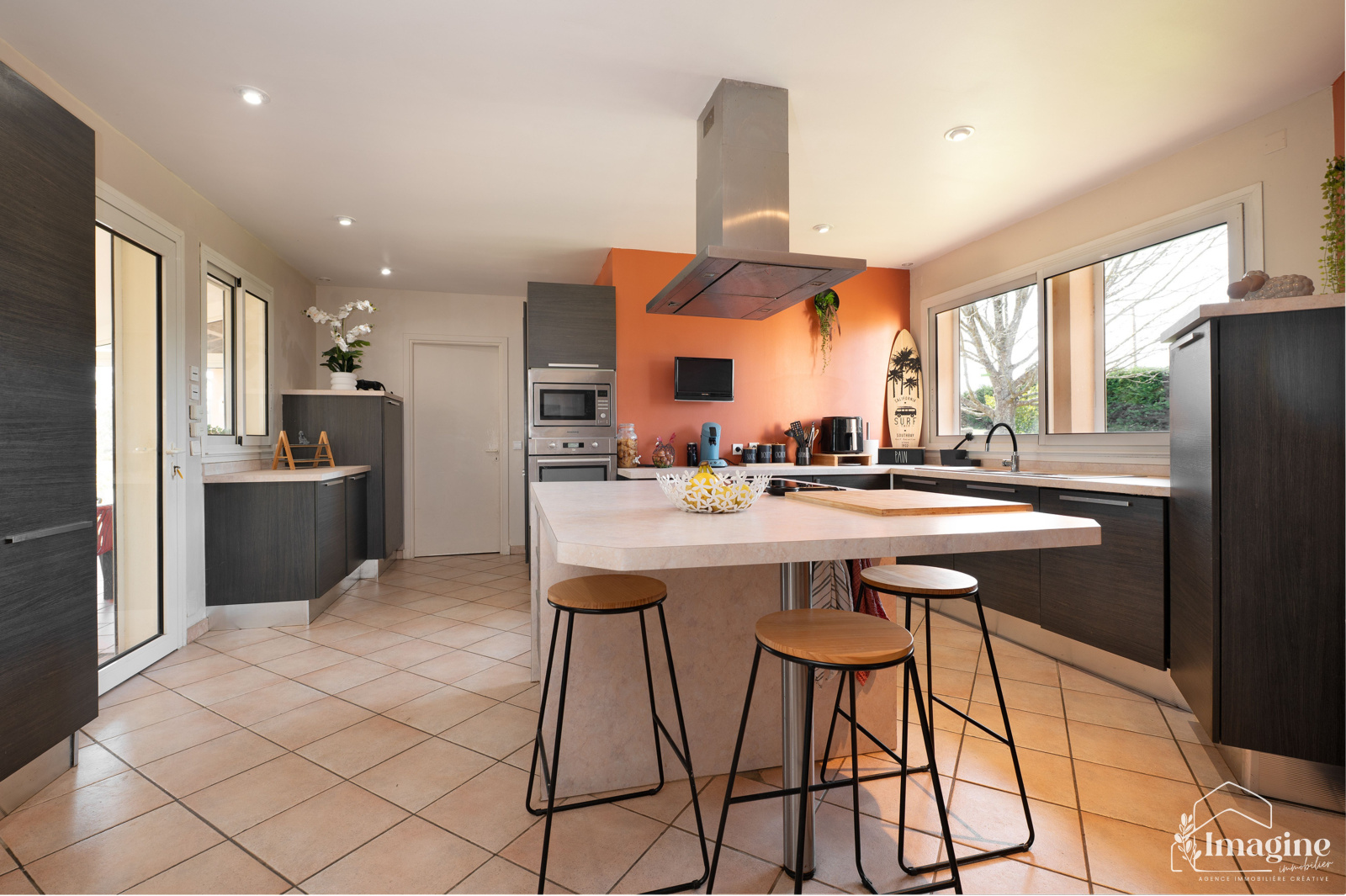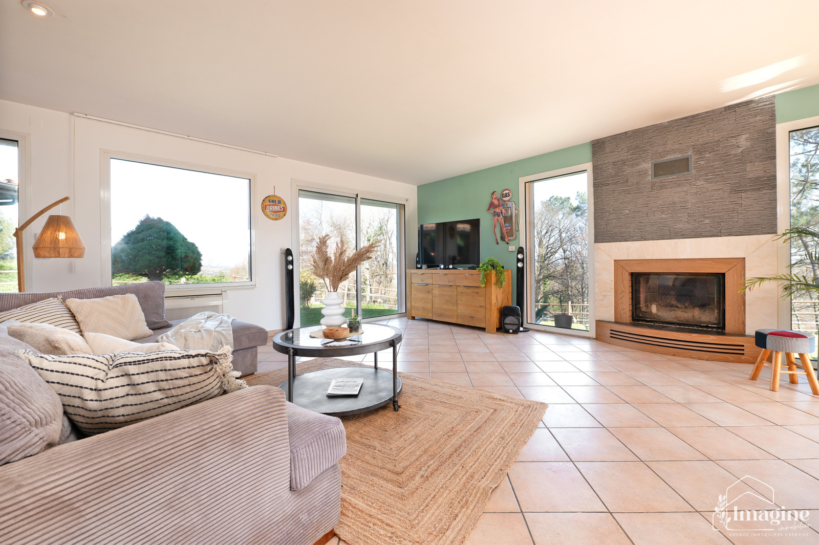 A l’intérieur, la maison développe 215 m² habitables. La majorité des pièces de vie sont en plain-pied. L’entrée distribue naturellement les espaces : une cuisine dinatoire rénovée de plus de 24 m² conviviale et lumineuse, communique avec une véranda de 17 m². Le salon/séjour de plus de 56 m², traversant et baigné de lumière grâce aux nombreuses baies vitrées, s’ouvre directement sur la terrasse et la piscine. L’ensemble crée un espace chaleureux où la vue sur la nature est omniprésente.