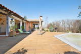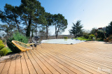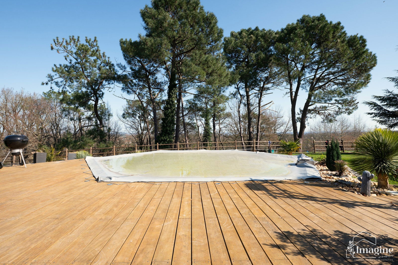 A l’extérieur, la terrasse se prolonge sur la piscine en bois avec plage en bois exotique, offrant une vue dégagée sur la partie boisée en contre bas. L’ensemble constitue un véritable havre de paix où il fait bon vivre, profiter des extérieurs et respirer la sérénité de la campagne tout en restant proche de la ville de Graulhet et ses commodités.